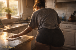 Yet here’s where it flips—the real passion often sneaks in through the back door. You get home, she’s in those old gym shorts (riding up just right from bending over), oversized t-shirt (no bra, fabric clinging from sweat, hair messy), cleaning the house. Not Victoria’s Secret lace and heels. Just comfortable, everyday shit—wiping counters, vacuuming, ass out naturally while she moves. For a lot of men, this organic vibe hits harder than any staged setup. No performance energy, no “seduction mode” pressure—just her in her element, unguarded, confident in her skin. That raw, unpolished look—sweaty from chores, casual clothes hugging curves—triggers primal attraction. It’s catching a private moment: vulnerable yet real, “this is mine” energy firing on instinct. Contrast to lingerie or romance scripts: Planned date nights, candles, surprises can feel performative—like a production where everyone’s supposed to hit marks. Over-planning kills spontaneity; it turns sex obligatory instead of animalistic. Romance, ironically, becomes a passion killer when it formalizes what should stay unpredictable. But this accidental scenario? Zero setup. She’s already in motion—body moving naturally—so the urge is immediate: “Damn, pull those shorts down and hit it from the back right here.” She might push back (“Look how I’m dressed, I need a shower”), feeling “gross” from cleaning. Guys often counter: “Nah, don’t worry—that’s what makes it hot.” Authenticity overrides the “perfect presentation” script. The casual, dressed-down look feels approachable, real—sexy without trying. Online echoes back this: Threads on Reddit and guy talks say tight shorts/sports bra or gym clothes beat lingerie any day. It’s effortless, relatable—her not performing, just being. In committed dynamics, that unscripted domestic lust feels earned and personal. No costume needed; the “same pussy” wrapped in real life becomes the upgrade.